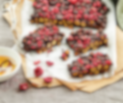2. Grovhakk nøttene og bland sammen i en bolle med tranebær, havregryn og vaniljesukker. Tilsett sirup og bland godt (det skal være en tykk og klissete masse). Press massen jevnt i formen, bruk gjerne en slikkepott som redskap. Stek i 18-20 minutter.