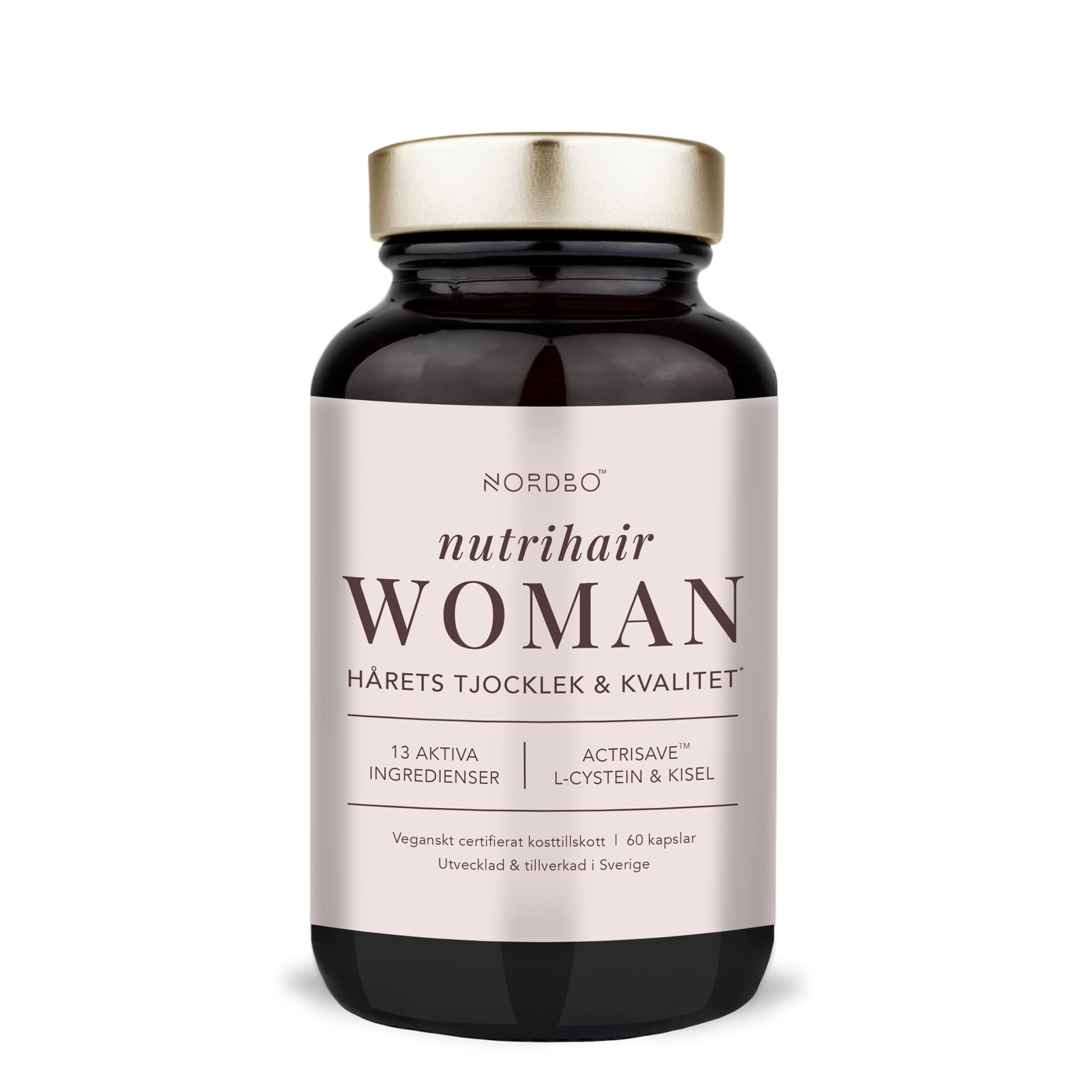 NORDBO Nutrihair Woman er utviklet for å redusere håravfall og forbedre hårkvaliteten hos kvinner. Med en omfattende sammensetning av 14 aktive ingredienser fokuserer Nutrihair Woman på de viktigste faktorene for sunt hår og normal hårvekst: hormonell balanse, tilførsel av næringsstoffer, redusert stress og stimulering av hårsekkene. Nutrihair Woman inneholder Actrisave™, en synergistisk blanding av svart ris og fikenkaktusblomst. At Actrisave™ er synergistisk betyr at ingrediensene styrker hverandre. Actrisave™ har dokumentert effekt på hårkvalitet og redusert håravfall. Hele 95% av studiedeltakerne opplevde en positiv effekt etter 6 måneders bruk. De første tegnene på effekt ble rapportert etter 2 måneder. Studien ble gjennomført i mai 2023. Om håravfall: hvert hårstrå gjennomgår tre faser: vekst (anagen fase), overgang (katagen fase) og hvile/avfall (telogen fase). Androgener bidrar til å kontrollere denne syklusen, men for mye androgenstimulering av hårsekkene fører til en kortere vekstfase, noe som resulterer i skjøre hårstrå som faller av før de har vokst ordentlig ut. Når noen opplever økt håravfall, er den telogene fasen mer dominerende enn den anagene fasen. Kapslene inneholder også blant annet bambus, havtorn, L-lysin, jern, kamille og L-cystein. L-cystein er en aminosyre som finnes i store mengder i håret. Kamille bidrar til mental og fysisk velvære. Bambus inneholder kisel, som bidrar til normal kvalitet på hår, hud og negler. Kun 1 kapsel per dag. Vi anbefaler at Nutrihair Woman brukes i minst 2 måneder. Fokuser på hodebunnen, der endringen først skjer. Dokumenter gjerne med før- og etterbilder. Nutrihair Woman er sertifisert som vegansk av Djurens Rätt. Boksen er laget av glass og lokket av metall. Glass og metall kan resirkuleres uendelig og gir fullstendig beskyttelse mot fuktighet og luft. Produktet er utviklet og produsert i Sverige av NORDBO - et familieeid merke fra Malmö, som utvikler kosttilskudd basert på innovasjon, dokumentasjon og bærekraftighet.