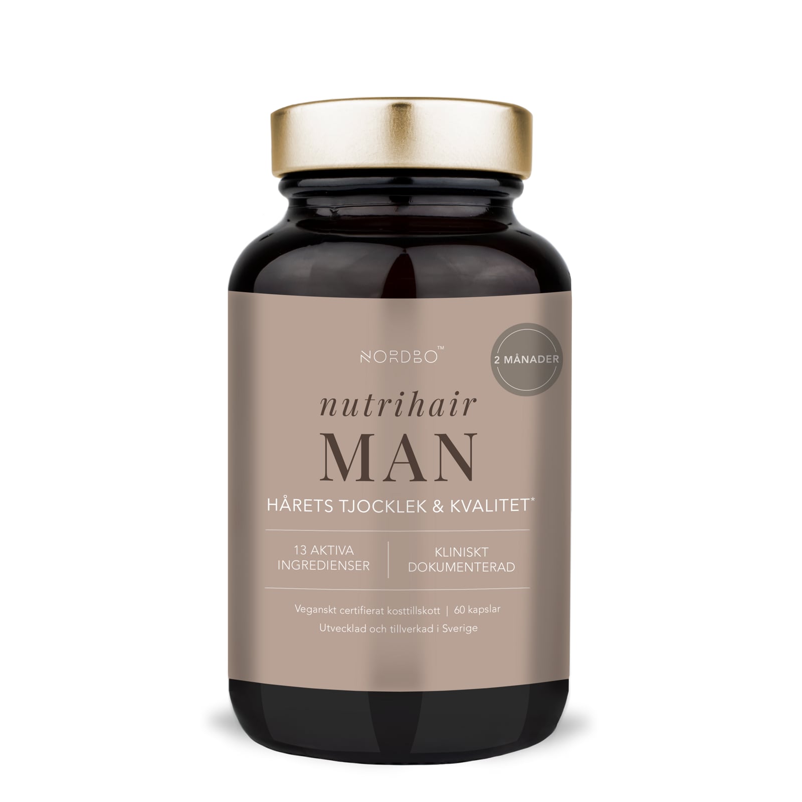 NORDBO Nutrihair Man er utviklet for å redusere hårtap og forbedre hårkvaliteten hos menn. Med en omfattende sammensetning av 13 aktive ingredienser fokuserer Nutrihair Man på de viktigste faktorene for sunt hår og normal hårvekst: hormonell balanse, tilførsel av næringsstoffer, redusert stress og stimulering av hårsekkene. Nutrihair Man inneholder Actrisave™, en synergistisk blanding av svart ris og fikenkaktusblomst. At Actrisave™ er synergistisk betyr at ingrediensene styrker hverandre. Actrisave™ har dokumentert effekt på hårkvalitet og redusert hårtap. Hele 95% av studiedeltakerne opplevde en positiv effekt etter 6 måneders bruk. De første tegnene på effekt ble rapportert etter 2 måneder. Studien ble gjennomført i mai 2023. Om håravfall: hvert hårstrå gjennomgår tre faser: vekst (anagen fase), overgang (katagen fase) og hvile/avfall (telogen fase). Androgener bidrar til å kontrollere denne syklusen, men for mye androgenstimulering av hårsekkene fører til en kortere vekstfase, noe som resulterer i skjøre hårstrå som faller av før de har vokst ordentlig ut. Når noen opplever økt håravfall, er den telogene fasen mer dominerende enn den anagene fasen. Kapslene inneholder også blant annet macarot, bambus, granateple, gresskarfrøekstrakt, kamille og L-cystein. L-cystein er en aminosyre som finnes i store mengder i håret. Kamille bidrar til mental og fysisk velvære. Bambus inneholder kisel, som bidrar til normal kvalitet på hår, hud og negler. Kun 1 kapsel per dag. Vi anbefaler at Nutrihair Man brukes i minst 2 måneder før første evaluering. Fokuser på hodebunnen, der endringen først skjer. Dokumenter gjerne med før- og etterbilder. Nutrihair Man er sertifisert som vegansk av Djurens Rätt. Boksen er laget av glass og lokket av metall. Glass og metall kan resirkuleres uendelig og gir fullstendig beskyttelse mot fuktighet og luft. Produktet er utviklet og produsert i Sverige av NORDBO - et familieeid merke fra Malmö, som utvikler kosttilskudd basert på innovasjon, dokumentasjon og bærekraftighet.