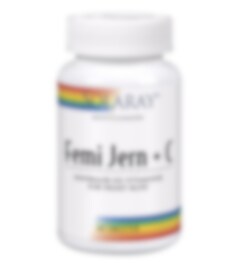 Jern anbefales spesielt for gravide og ammende. Det er en fordel å ta jern sammen med vitamin C da dette bidrar til å øke opptaket av mineralet. Man bør ikke ta jern sammen med melk eller andre kalsiumkilder, heller ikke med kaffe eller te, da dette forringer opptaket. Solaray Femi Jern + C inneholder jern bundet til den organiske syren fumarsyre og vitamin C for optimalt opptak i kroppen. Femi Jern + C inneholder i tillegg vitaminene B-5, B-9 og B-12, organisk bundet sink, kobber og mangan og mineralrike nesleblad, steinnypefrukt, brokkoli, persilleblad og gulrot.