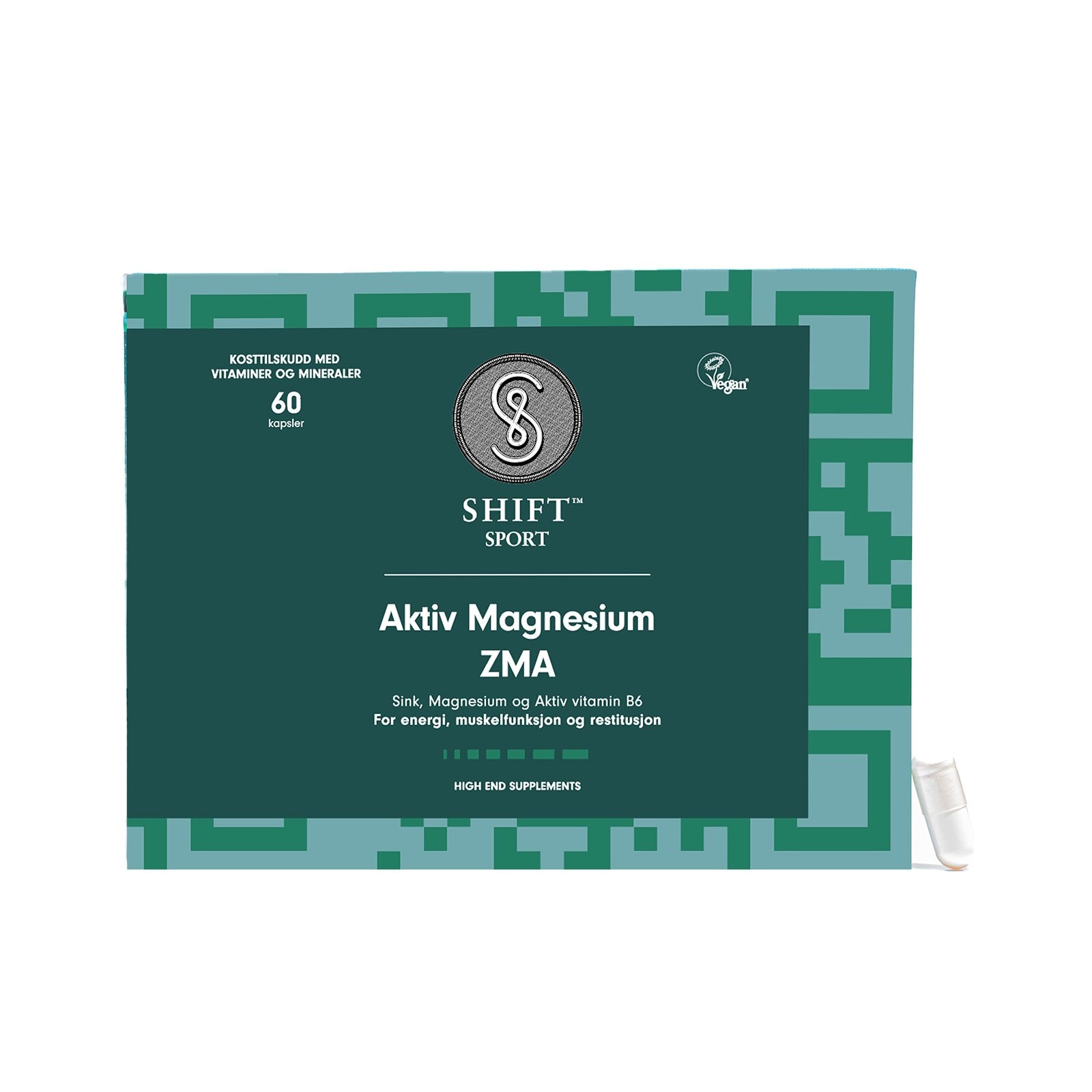 SHIFT™ SPORT Aktiv Magnesium er et magnesiumtilskudd for aktive mennesker, tilsatt sink og vitamin B6. Denne kombinasjonen er også kjent som ZMA, som er en forkortelse for zinc (sink), magnesium og aspartate (asparaginsyre). Magnesium og sink er bundet til aminosyren glysin, noe som danner magnesiumglysinat og sinkglysinat, for et bedre oppptak. Vitamin B6 er i sin biologisk aktive form, P5P, som kroppen kan bruke direkte. Magnesium er viktig for å opprettholde elektrolyttbalansen og bidrar til normal muskelfunksjon, og kan benyttes for å redusere lette kramper i beina. Sink spiller en sentral rolle i normal proteinsyntese og bidrar til immunforsvarets normale funksjon. Vitamin B6 støtter normal energiomsetning og nervesystemets normale funksjon.