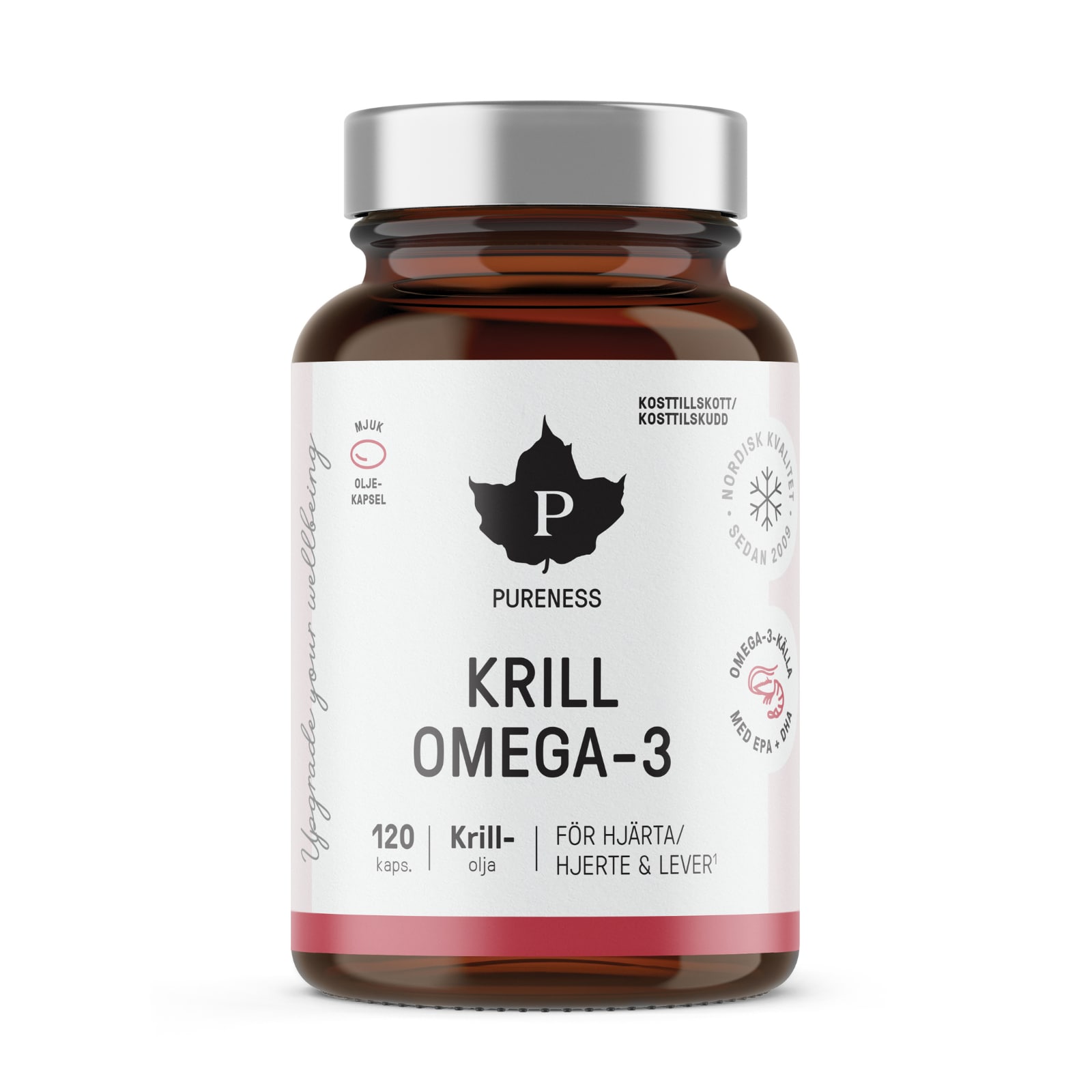 Flerumettede fettsyrer som Omega-3 støtter hjertets, leverens og fettstoffskiftets normale funksjon. For oss er det alltid viktig med rene ingredienser. Pureness Krill Omega-3 inneholder krillolje.