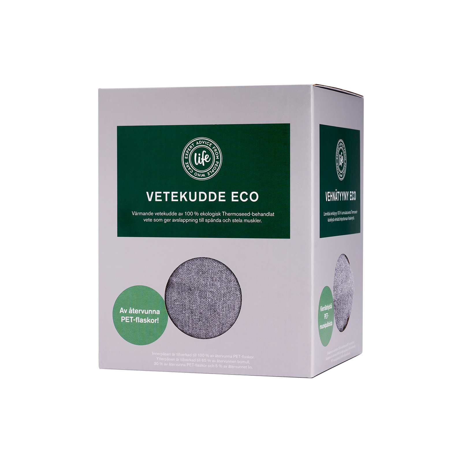 Life Hvetepute Eko er en klassisk hvetepute, som er bærekraftig produsert. Innerposen er produsert av 100% resirkulert materiale fra PET-flasker. Putetrekket er produsert av 65 % resirkulert bomull, 30% resirkulerte PET-flasker og 5 % av resirkulert lin.