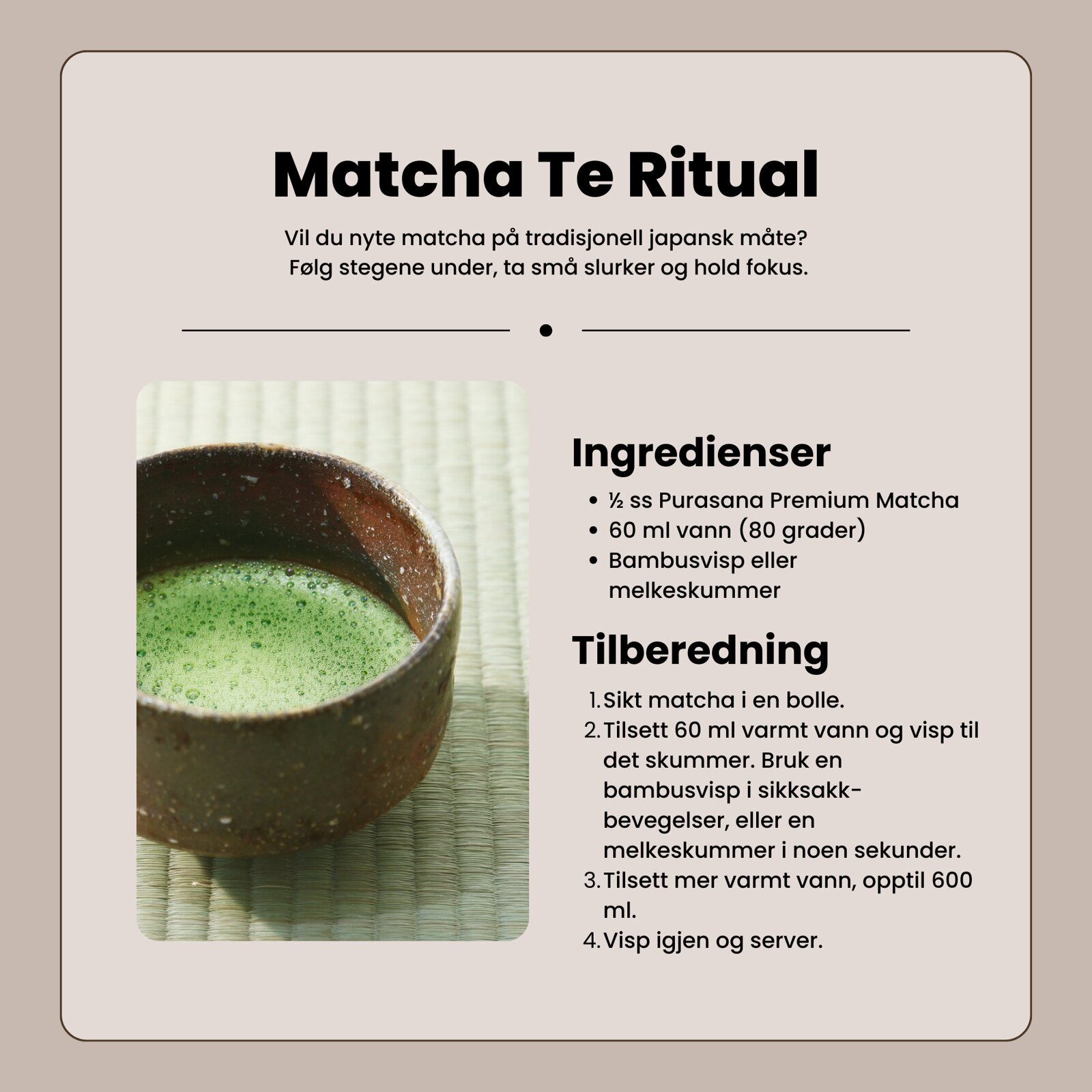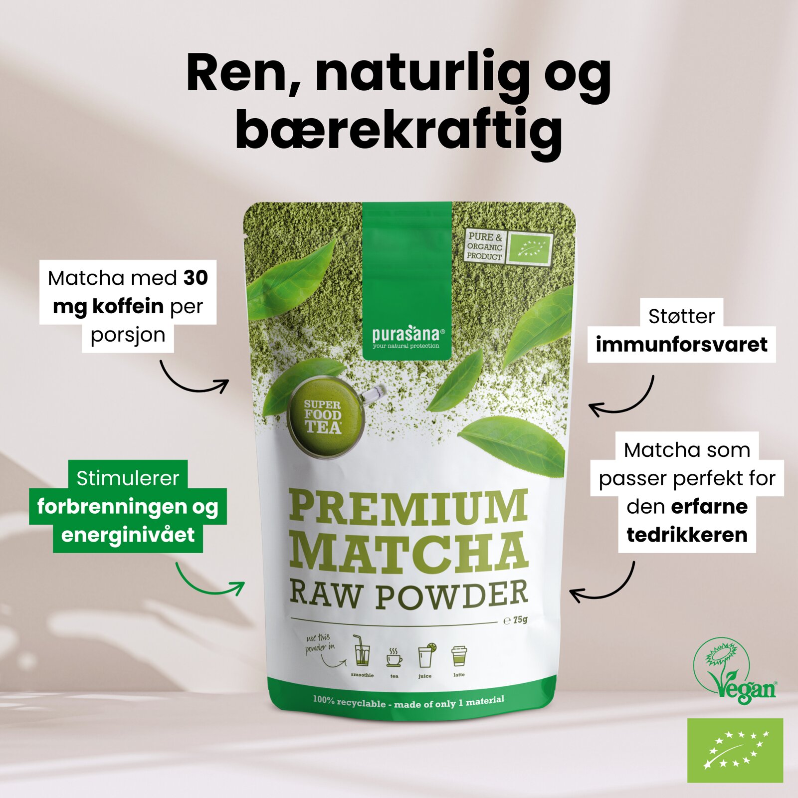 Purasana Matcha kommer fra Japan, landet med den beste teen! Den grønne teen går igjennom en skånsom og intensiv produksjonsprosess hvor tebladene blir plukket, dampet og malt til pulver. Sammenlignet med annen grønn te har matcha en mildere smak og en skarp grønn farge.