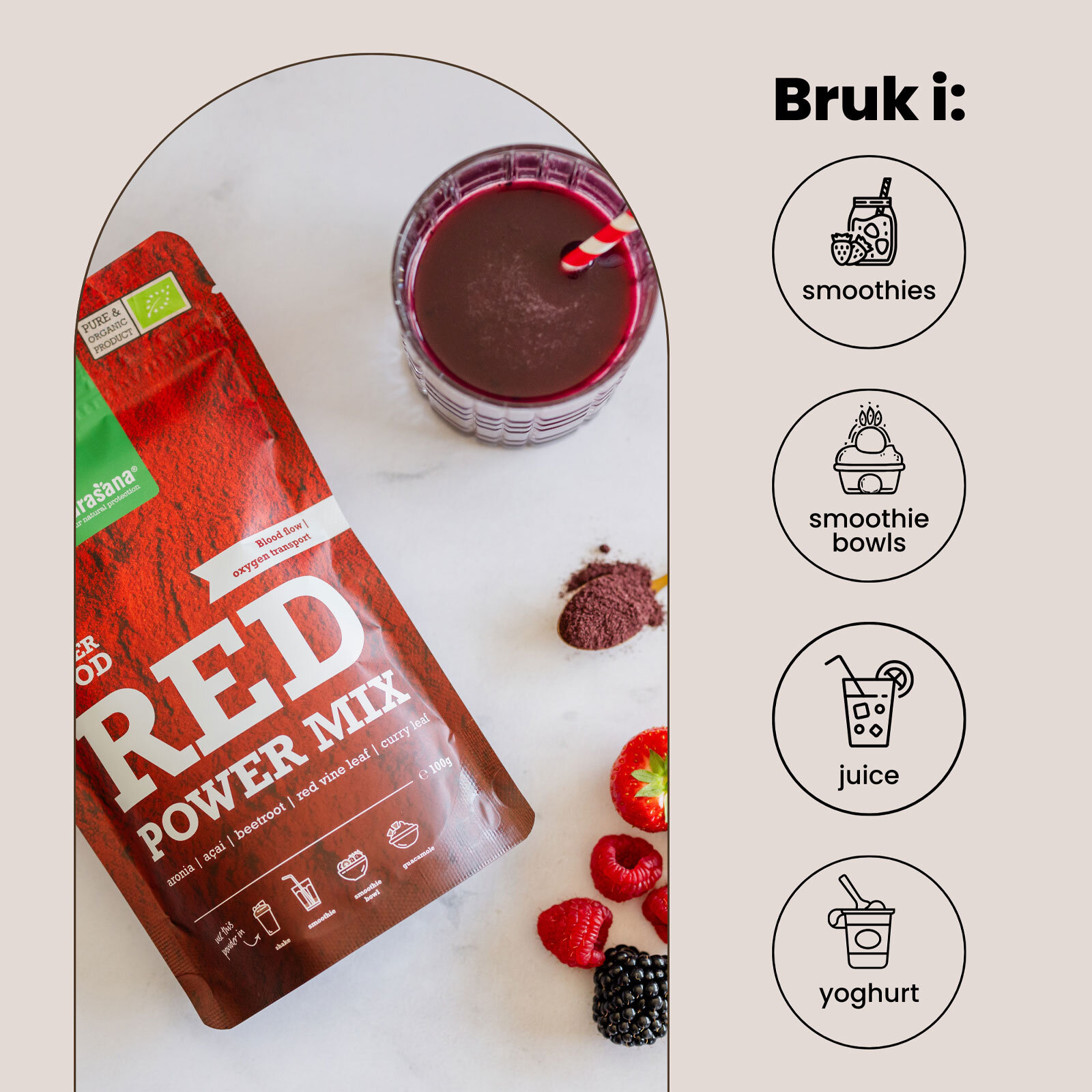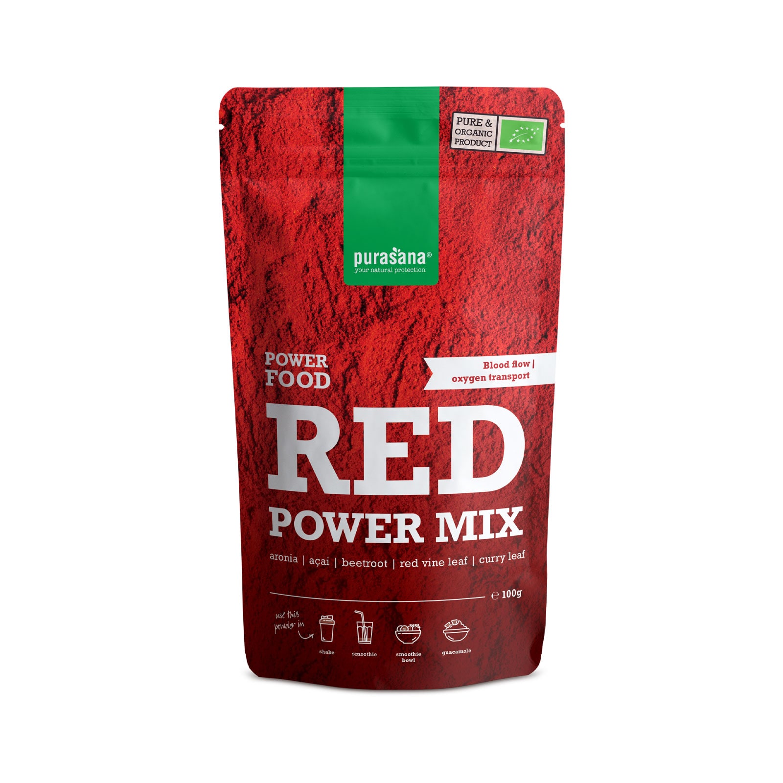 Red Power Mix er en økologisk superfood blanding laget av rødbete, acai, aronia, vindrue- og karriblad. Perfekt for deg som ønsker å stimulere blodsirkulasjonen og øke energinivået - både før og etter fysisk aktivitet. - Full av antioksidanter, beskytter cellene mot oksidativt stress (ORAC score: 688) - Bidrar til god blodsirkulasjon - Øker oksygentilførselen og energiproduksjonen - Øker oksygentilførselen og energiproduksjonen