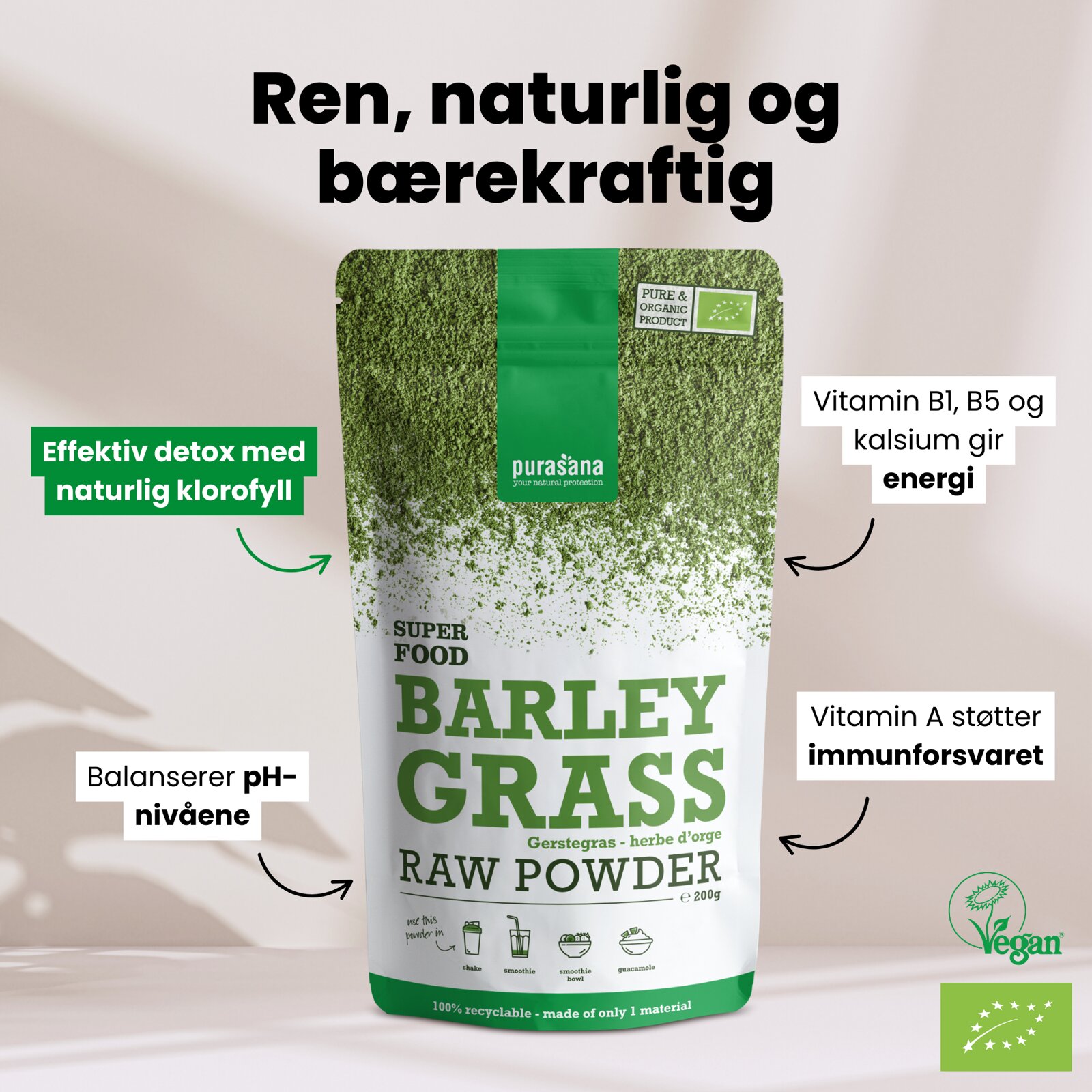 Purasana kaldpresset bygg-gress juice -pulver er laget av unge bygg-gressskudd. Full av klorofyll og enzymer.