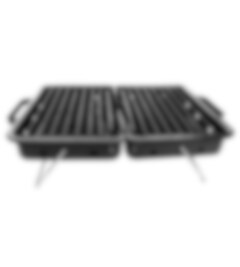 Minigrill med to kammere og medfølgende underlagsmatte er en fleksibel, lett og enkel kullgrill å betjene. Fyll den med briketter og legg den i sekken.