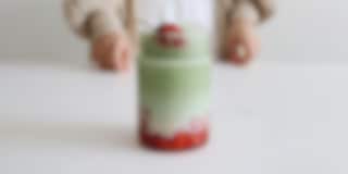 Ha knust jordbær i et glass, tilsett isbiter, melk og helt til slutt matchablandingen.