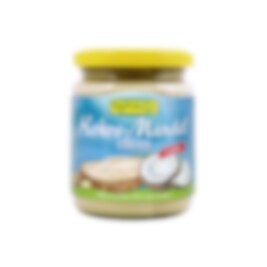 Rapunzel Kokos og mandelsmør vegan. Et lyst kremaktig pålegg med en mild mandel- og kokossmak og en søt følelse av kokos og vanilje. Mandlene er forsiktig ristet og blandet med kokos og de andre verdifulle ingrediensene til en delikat smeltekrem.