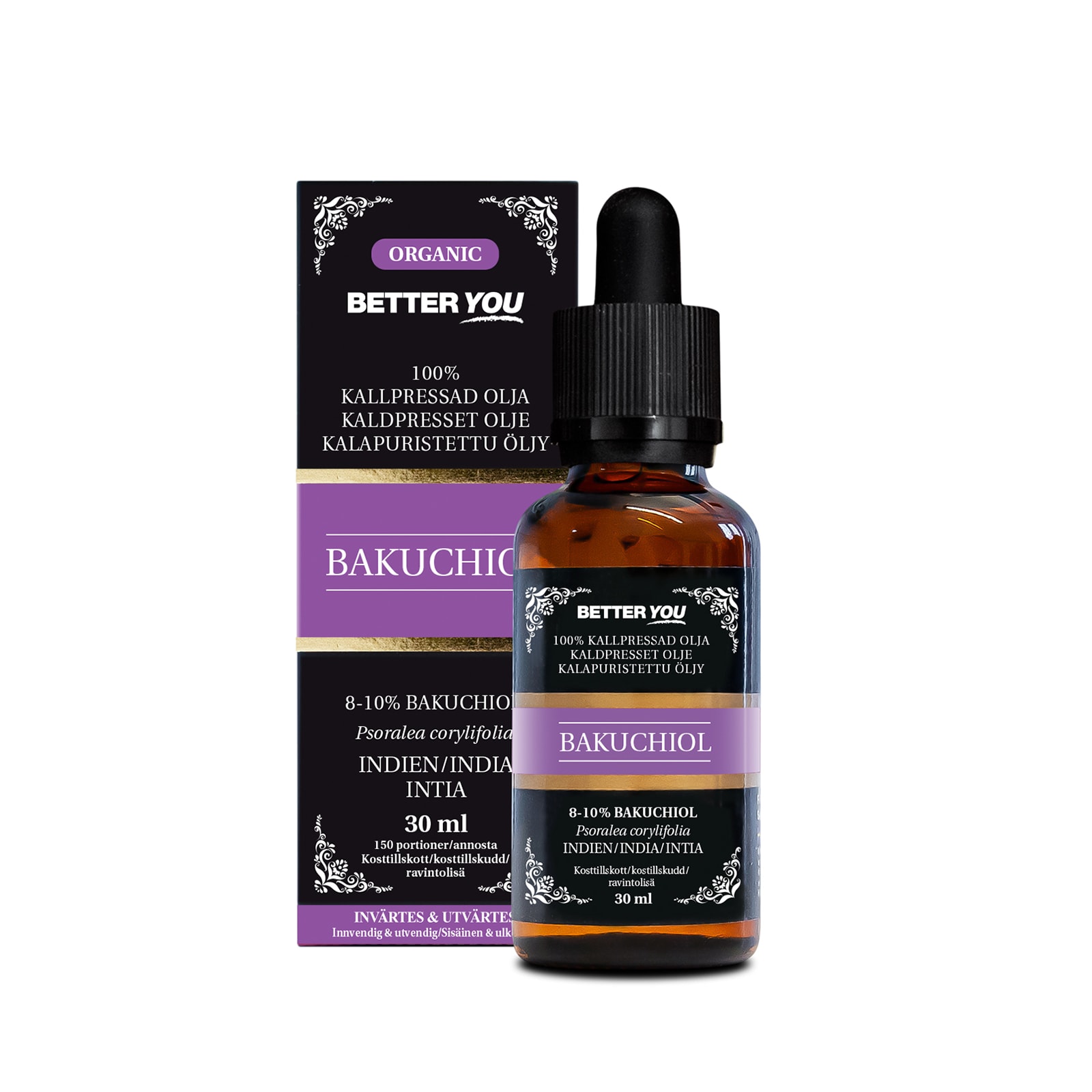 Bakuchiol er en plantebasert ingrediens som utvinnes fra frøene til Psoralea corylifolia. Råvaren stammer fra tradisjonell plantebruk i Asia og brukes nå hovedsakelig som ingrediens i moderne hudpleieprodukter. Bakuchiol er verdsatt i kosmetikk for sin plantebaserte profil og brukes i produkter der man søker et alternativ til syntetiske ingredienser. Oljen inneholder naturlig forekommende plantestoffer og fettsyrer, som bidrar til dens karakter som kosmetisk råstoff. Bakuchiol brukes i svært små mengder som ingrediens i ferdige formuleringer eller i hjemmelagde kosmetiske produkter, hvor konsentrasjonen justeres i henhold til bruksområde og type formulering. Produktet leveres i en mørk glassflaske med pipette for nøyaktig dosering i kosmetiske sammenhenger.